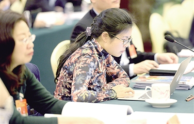 人大重庆团杨帆代表(左二)聚精会神地查阅资料,精心准备发言稿。