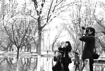 北京玉渊潭公园第二十七届樱花节日前开幕。公园内早、中、晚樱20余个品种,2000余株樱花将次第开放。此外,公园里3万多株天竺葵、山桃、迎春、连翘等花木也将在活动期间绽放报春。图为游客在公园内欣赏拍摄樱花。