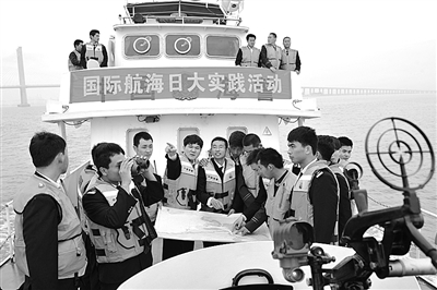 日前,福建海警二支队邀请泉州师范学院航海学院学生在泉州后渚港开展“保卫蓝色国土,维护海洋权益”主题实践活动,为学生们进一步普及航海知识和增强海洋保护意识。图为学生和官兵在舰艇上开展海图作业实践活动。 新华社记者 林善传摄