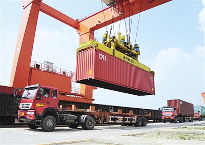 大连港相关负责人表示,大连港过境集装箱班列的强劲增长,不仅意味着“辽满欧”国际运输通道正在加速升温,也为辽宁乃至东北地区融入“一带一路”国家战略带来契机。图为驶向欧洲的过境集装箱班列在大连港大窑湾铁路中心站装车。