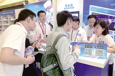 博鳌亚洲论坛开通“博鳌通”新媒体平台,全方位地动态宣传博鳌亚洲论坛会议。图为参会人员在“博鳌通”展示台前向工作人员了解新媒体平台使用方法。