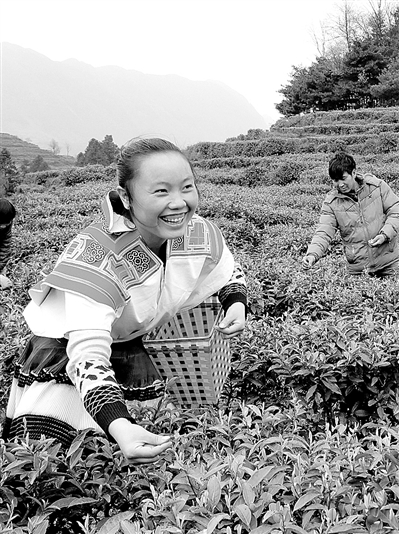 左图 眼下,贵州省纳雍县茶园进入采摘期,图为茶农在该县姑开乡“山外山”茶场采摘春茶。本报记者 吴秉泽 通讯员 李 践摄影报道