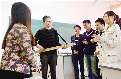3月31日,江西师范大学物理与通信电子学院老师胡银泉用电磁感应吉他为学生演奏。胡银泉利用电磁感应原理和声音传播规律制作了一批“花样乐器”,通过乐器演奏的方式向学生讲解物理学知识。他说,很多物理规律大都是看不见、摸不着的“书本知识”,通过音乐的方式给学生上课,不仅能形象地讲明物理学原理,更能让学生对物理学产生浓厚的兴趣。