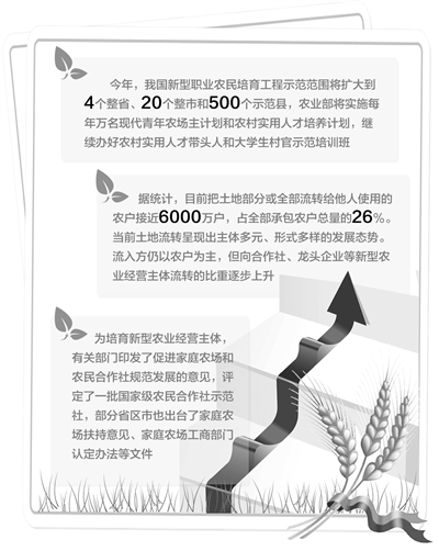 今年政府工作报告提出,要在稳定家庭经营的基础上,支持种养大户、家庭农牧场、农民合作社、产业化龙头企业等新型经营主体发展,培养新型职业农民,推进多种形式适度规模经营。截至目前,全国已有家庭农场87.7万家、农民合作社126.7万家、龙头企业12万多家。土地流转面积已经达到3.8亿亩,占全国耕地面积的28.8%,比2008年底提高20个百分点