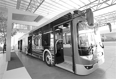 4月16日,18米超级电容储能式BRT快速公交车在中国南车宁波基地下线。电车无须架设空中供电网,只需在公交站点设置充电桩,利用乘客上下车30秒内即可将电充满并维持运行5公里以上。 新华社记者 鞠焕宗摄
