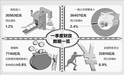 全国财政收入增速今年一季度仍处于低位,同口径增长2.4%。受到全国工业生产者出厂价格(PPI)连续下滑,以及市场需求不振造成销售额“上不去”的影响,第二产业对增值税的拉动作用有限;房地产市场不景气,与房地产相关的部分税种税收增速明显下滑。