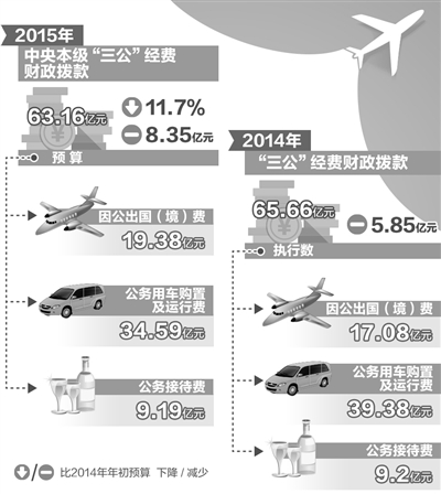 根据财政部17日公布的数据,2015年中央本级“三公”经费财政拨款预算63.16亿元,比2014年年初预算减少8.35亿元,下降11.7%。记者注意到,按照中央和国家机关公务用车制度改革的要求,很多部门未安排2015年公务用车购置费预算,公务用车运行费降幅较大。一些部门则有相关支出并说明原因。比如,交通运输部安排公务用车运行费14148.75万元,比2014年预算数增加8114.58万元。交通运输部解释,这主要是船舶港务费改革相应增加的公务用车运行费。
