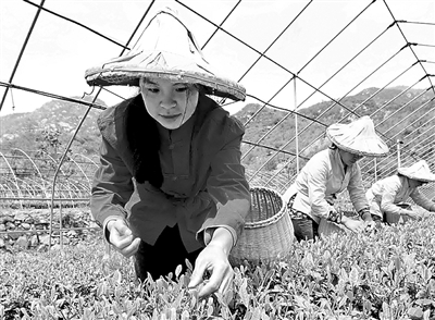 河北省邢台市高级茶艺师杨素珍2012年将30万株龙井茶从杭州移植到临城县,这些茶树全部成活,目前进入收获期。图为4月24日,河北省临城县东篱茶园的工人在采摘茶叶。 新华社记者 郭雅茹摄