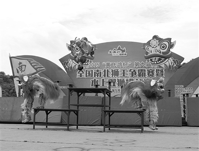 左图 5月1日,作为中国狮赛世界杯的“黄飞鸿杯”第九届全国南北狮王争霸赛在广东佛山西樵山天湖公园开战,此届赛事共海选了19路南北狮王参赛。图为比赛现场。