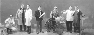 展览共展出五幅巨幅画作,劳模们依次出现在其中。这个历时半年,数易其稿的巨大工程皆出自中国美术学院老中青三代著名画家之笔。此次创作开创性地将传统中国画中的绣像技法与西方油画技艺相结合,写实与写意的融合更进一步提升了人物精气神的塑造,在艺术上达到了极高的审美境界。