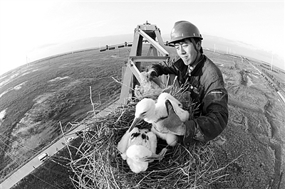 大庆供电公司输电运维人员王琦珂在220千伏大春甲乙线18号铁塔处发现一处鸟窝,为了保证白鹤和输电安全,他帮它们找到了新家——大庆市龙凤湿地自然保护区管理中心喂养。
