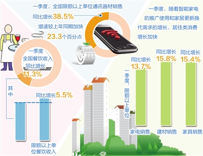 数据显示,今年一季度全国实现社会消费品零售总额7.1万亿元,同比名义增长10.6%。其中,网络零售保持强劲势头,一季度全国网上商品零售额增长41%,占社会消费品零售总额的比重达到8.9%,对社会零售总额增长的贡献率达到27.1%。另据商务部监测,一季度5000家重点零售企业网上商店销售额增长39.7%,增速较上年同期加快14.5个百分点。