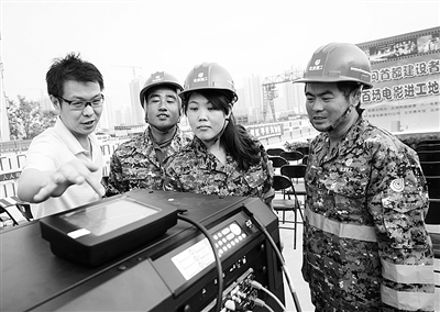 上图 “五一”期间北京青年宫、北京建工集团等单位举办了“百场电影进工地”活动。图为工作人员为北京地铁16号线建设者介绍电影放映机原理。 本报记者 赵 晶摄