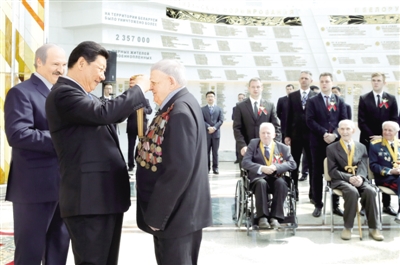 颁奖结束后,习近平发表讲话,代表中国政府和人民向老战士们致以崇高敬意和诚挚问候。习近平指出,第二次世界大战期间,白俄罗斯人民打响了卫国战争的第一枪,表现出百折不挠的英雄主义精神,赢得了世界各国人民的广泛赞誉和尊重。今年也是中国人民抗日战争胜利70周年。中国人民抗日战争开始时间最早,持续时间最长,付出的牺牲也最大,为世界反法西斯战争胜利作出了不可磨灭的重要贡献。当年在共同抗击法西斯主义和军国主义侵略的战争中,白俄罗斯人民同中国人民并肩作战,用鲜血结下了牢固友谊。我们深切怀念那些为夺取抗战最终胜利、保卫世界和平而献身的两国英烈,中白两国人民将永远铭记他们的丰功伟绩。卢卡申科总统在卫国战争历史博物馆新馆开馆时曾说过,对篡改第二次世界大战历史、美化侵略的企图,白俄罗斯人民绝不会答应。我对此深表赞同。我们愿同包括白俄罗斯人民在内的世界人民一道,共同维护第二次世界大战胜利成果和国际公平正义。