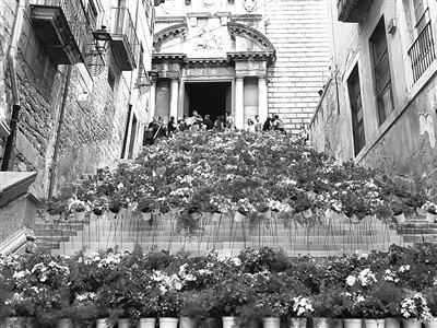 西班牙东北部小城赫罗纳2015年鲜花节于5月9日至17日举行。节日期间这座古老的小城华丽变身为一个大花园。图为鲜花节期间小城赫罗纳街头鲜花装饰。 新华社发