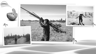 一丛丛、一簇簇随风摇摆的柠条金枝和远处的红柳、白杨相映成趣,把马占荣的种树窝棚装扮一新。在小黑狗的叫声中,65岁的老马带着记者攀梯上到这6间小砖房的屋顶。极目远眺,远山没有一丝绿色的沙丘沉默着。“50岁的时候我从包头跨黄河来到这里种树,所见全是这样的明沙。”清瘦的老马不改当年豪气,“前方有砖头的地方,是我当年挖的地窨子。往下掏个比树坑又深又大的穴,上面搭上杆子,铺上塑料布,地鼠一样在这里安营扎寨。第二天一早,胡噜胡噜头上的沙子就开始种树。”