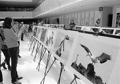 5月19日上午,第二十一届中国(三门峡)国际黄河文化旅游节暨投资贸易洽谈会在天鹅湖国家城市湿地公园开幕。图为观众在欣赏图片。