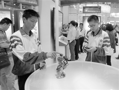 由教育部、联合国教科文组织、中国联合国教科文组织全委会主办,青岛市人民政府承办的全国教育信息化应用展览,于5月23日至25日在青岛举办。图为5月24日,两名中学生在展览上体验操作机器人。