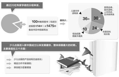 记者了解到,今年参评图书整体质量好于往年,发行量也较为可观。通过20位专家学者的分组审读,100种推荐图书(包括引进版图书14种)从1475种备选书目中脱颖而出。据统计,思想品德、励志读物、人文历史、艺术修养类30种;科普百科知识类24种;低幼启蒙、图画卡通类10种;儿童文学读物类36种。