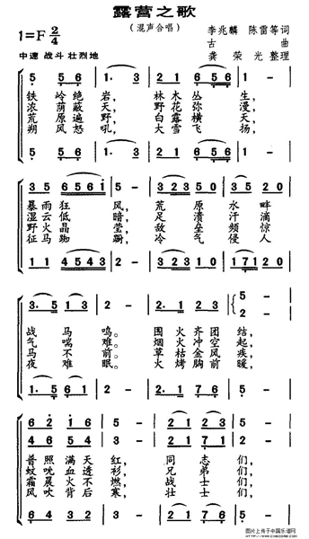 《露营之歌》全曲首次发表在1939年的《革命歌集(第二集)》中,是东北抗联三军集体智慧的结晶。战后收存于中央档案馆一直没有对外公开,直到1999年才被公之于世。