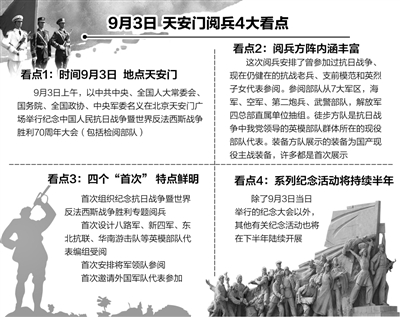 9月3日天安门广场阅兵有几个鲜明特点:首次组织纪念抗日战争暨世界反法西斯战争胜利专题阅兵,首次设计八路军、新四军、东北抗联、华南游击队等英模部队代表编组受阅;首次安排将军领队参阅,首次邀请外国军队代表参加,是一次传承历史与未来、沟通中国与世界、传递和平与发展的阅兵庆典。