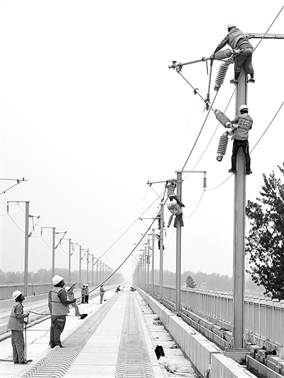 7月3日,中铁电气化局集团三公司的工人在施工工地安装接触网腕臂。近日,郑(州)徐(州)客运专线电气化施工全面展开,预计将于今年年底竣工。郑徐客运专线线路全长361.937公里,跨越豫、皖、苏三省,于2012年12月26日正式开工。新华社记者 李 安摄