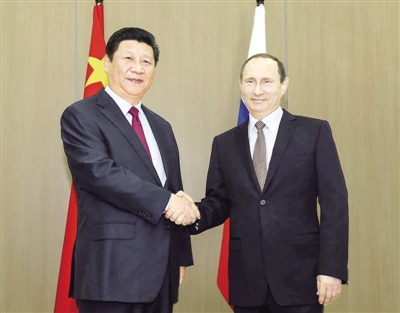 普京表示,很高兴时隔两个月在乌法再次接待习近平主席。俄中全面战略协作伙伴关系正在深入发展。双方各领域交流密切,在国际事务中保持积极合作。俄中经贸关系日益重要。中国已成为俄罗斯第一大贸易伙伴,两国金融领域合作进一步发展。俄方积极参与中方发起的亚洲基础设施投资银行筹建工作。俄中两国基础设施、能源、航天、高新技术等领域合作稳步推进。我同习主席今年5月决定开展丝绸之路经济带建设同欧亚经济联盟建设对接合作,相信将为两国经济合作提供更大动力。俄中人文交流增进了两国人民相互了解和友谊,俄方赞同办好两国媒体交流年活动。