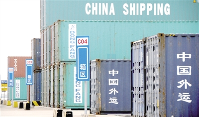图为江苏连云港集装箱码头出口贸易区堆场堆满了等待装船的出口货物。