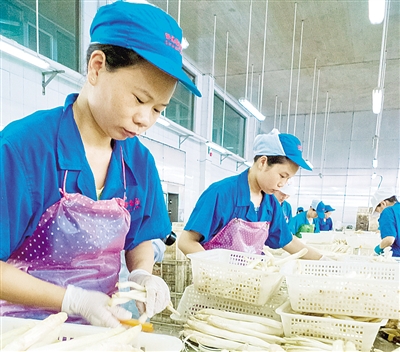 图为山东枣庄市山亭区一家食品企业的员工在生产出口罐头产品。