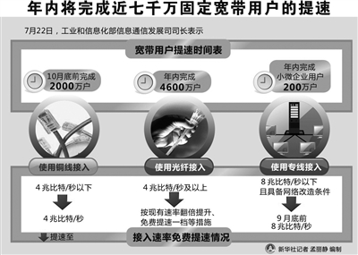 对于广大网民关心的网速问题,他表示,使用光纤技术接入的固定宽带用户,接入速率在4Mbps及以上的,实施按现有速率翻倍提升、免费提速一档等措施,现已惠及超过750万用户,预计全年受惠用户超过4600万户。同时,对于与“互联网+”行动计划密切关联,使用专线宽带、接入速率在8Mbps以下且具备网络改造条件的小微企业用户,9月底前全部将专线免费提速至8Mbps,目前,这项工作已经惠及50万小微企业用户,预计全年受惠超过200万户。