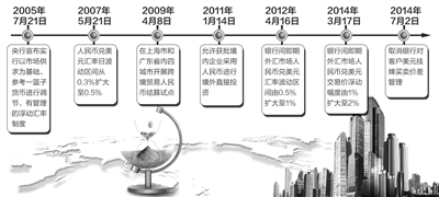 从2005年7月中国人民银行宣布人民币汇率形成机制改革至今,汇改已走过了10年的路程。10年间,从人民币兑美元汇率中间价累计升值35%,到汇率浮动区间逐步扩大;从汇率形成机制越来越市场化,到人民币国际化不断向前推进……