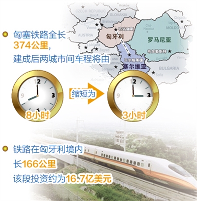 西雅尔多指出,布达佩斯—贝尔格莱德铁路在匈牙利境内长166公里,匈境内路段的投资为4720亿福林(约合16.7亿美元)。匈塞铁路建设大约需要两年半的时间,建成后将大大缩减旅行时间。