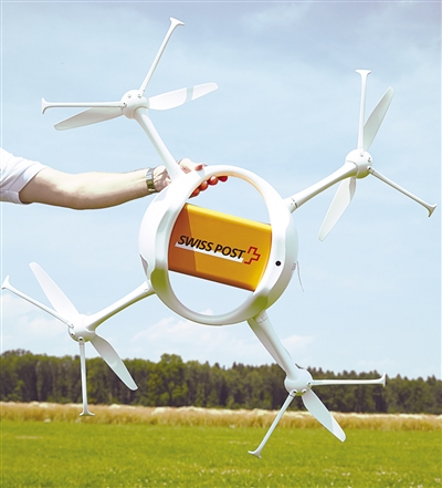 在位于瑞士巴斯—维利的试飞现场,一架白色四翼无人机携带印有“瑞士邮政”标识的包裹飞驰而过。这款商业版四轴无人机的结构极为轻巧,有4个支架,从马桶座大小的空心环延伸出去,4个支架尾端都装有螺旋桨。空心环的中间放有一个黄色盒子,上印“瑞士邮政”标识。在实际运行中,这个位置用来放置快递邮包。