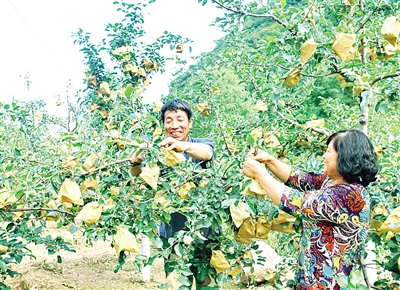 河北省承德市宽城满族自治县大前坡峪村的郑文柱夫妇在管理自己的苹果园。近年来,承德立足于为京津涵养水源,大力发展经济林,力促经济发展和生态建设实现“双赢”。目前,全市已累计完成经济林栽植113.16万亩。 李树春摄