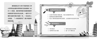 根据教育部在2014年7月发布的《中小学学生赴境外研学旅行活动指南(试行)》规定,境外研学旅行的教育教学内容和学习时长所占比例,一般不少于境外全部行程计划的一半。一位业内人士坦言,“一半时间学习”很少有游学团能实现。