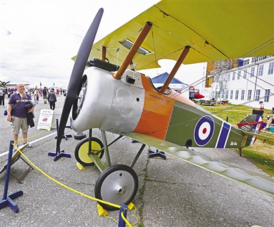 温哥华边界湾航空展日前在加拿大温哥华地区三角洲市开展,今年边界湾航空展为庆祝二战结束70周年展出了多架古董战机,并进行空中飞行表演。图为民众近距离欣赏一架古董飞机。 新华社发