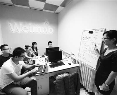 河北省张家口市大学生创业园主要服务对象是初创小微企业的大学毕业生,园区对入驻的大学生创业者提供创业孵化“一条龙”服务。创办一年以来,创业园登记入驻小微企业达254家,有1130名大学生在创业园实现创业就业。图为千儿信息科技有限公司的大学生创业者在大学生创业园研讨业务。