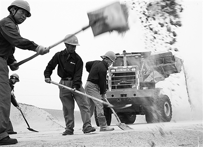 除贯穿南北的沙漠公路有完善的防沙工程外,许多大漠中的公路都属于伴引路、临建路等,一夜风沙,公路就可能被流沙掩埋。为确保沙漠公路畅通,保证油田生产正常运行,护路工常年奋战在沙漠公路沿线,与风沙和高温搏斗。 丁 伟摄