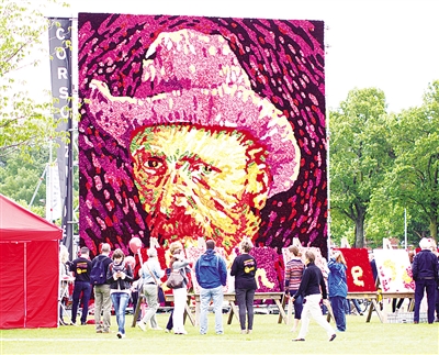 7月29日是著名荷兰画家梵高逝世125周年纪念日。在阿姆斯特丹博物馆广场,人们用5万多朵鲜花制作了一幅高8米的梵高像,以纪念这位艺术大师。图为参观者在荷兰阿姆斯特丹博物馆广场欣赏用鲜花组成的梵高画像。 新华社发
