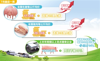 农业部畜牧业司对全国480家集贸市场的监测数据显示,7月最后一周,全国生猪和猪肉每公斤均价为17.51元、26.76元,分别连续19周和18周上涨,累计涨幅分别高达44%和26%。
