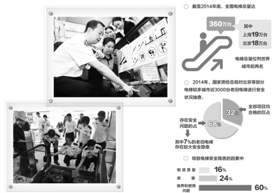 2014年,全国共发生48起电梯事故、死亡36人。其中,乘客违规使用造成21起事故,占大多数。由于设备原因造成的事故仅8起。违规使用表现在:违规使用三角钥匙;对儿童监护不力;乘客在箱体里等待救援时违规自救,强行扒开轿厢等。由于设备本身造成的事故原因则集中在制动器、扶梯驱动链条发生失效等。