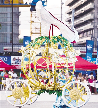 加拿大多伦多日前举行的“加勒比赛装会”上,众多参赛者身着盛装亮相,角逐本届狂欢节的“盛装之王”与“盛装之后”称号。图为参赛者展示盛装。 新华社发