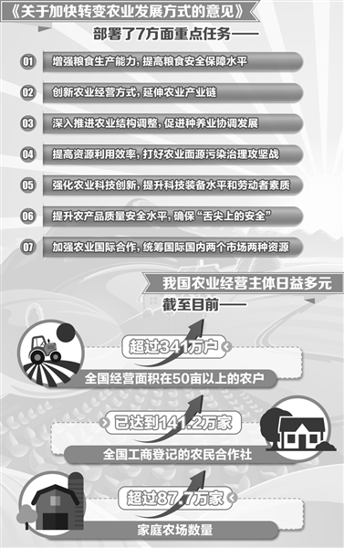 截至目前,全国经营面积在50亩以上的农户超过341万户,全国工商登记的农民合作社已达到141.2万家,家庭农场数量超过87.7万家。为创新农业经营方式、加快培育新型主体,《意见》提出研究改革农业补贴制度,使补贴资金向种粮农民以及家庭农场等新型农业经营主体倾斜;在全国范围内引导建立健全由财政支持的农业信贷担保体系。