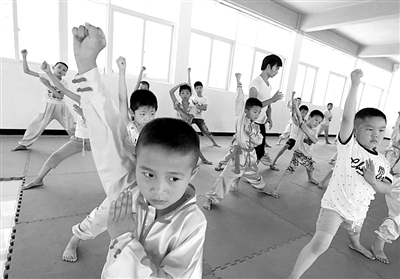 8月6日,湖北省竹山县宝丰镇部分留守儿童在该镇舞音艺术教育中心练习武术基本功。暑假期间,该县教育局组织留守儿童纷纷利用假期参加跆拳道等武术基本功培训,锻炼体魄,磨炼意志,在强身健体的运动中“武”出精彩、充实、快乐的暑假。 朱本双摄