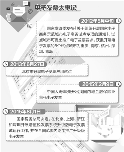 据悉,2012年8月起,税务总局会同发改委、财政部等部门启动了电子发票试点工作。试点工作以电子商务领域试行电子发票为主,主要应用于电商企业向不需记账报销的个人消费者开具,目前试点工作在北京等10多个城市开展。