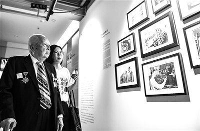 8月9日,深圳越众历史影像馆,志愿者向老兵、原新一军新30师89团团部直属输送连少尉排长蔡腾芳(左)介绍展览内容。当日,“国家记忆——越众历史影像馆藏海外收集抗战影像展”在深圳越众历史影像馆开幕,展出该影像馆近年从海外收集的大量抗战影像。 新华社记者 毛思倩摄