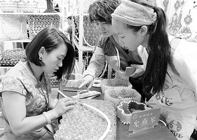 8月7日,“陇原巧手”允燕琴向游客介绍提包的手工编织方法。当日,丝绸之路旅游产品展览会暨甘肃省“陇原巧手”妇女手工编织产品展销会在甘肃张掖举行。“陇原巧手”是由甘肃省妇联发起的妇女手工编织就业扶贫行动,目标为在5年内培训10万“陇原巧手”、带动100万贫困妇女就业增收。 张 鸿摄