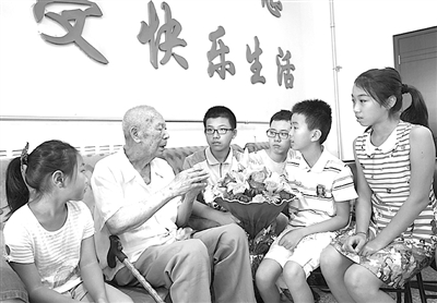 8月6日,北京市房山区燕山石化党员活动室,抗战老兵张占福在给小学生们讲述当年的抗战经历。近年来,燕山石化积极组织老年志愿者队伍,进企业、进社区、进学校、进家庭,发挥老职工的余热,教育和影响青年职工和社区青少年。 赵 强摄