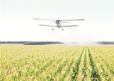 8月11日,位于黑龙江省黑河市的黑龙江垦区五大连池农场用飞机为玉米喷施营养液。此次航化作业,喷施防病、防虫、促早熟的营养液,为玉米“贴秋膘”,以提高玉米的品质和产量。 陆文祥摄(新华社发)