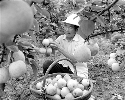 8月23日,河南省南阳市社旗县朱集镇农民在梨园采摘黄金梨。该县的黄金梨由于品种好、产量高,比普通甜梨提前30多天上市。
